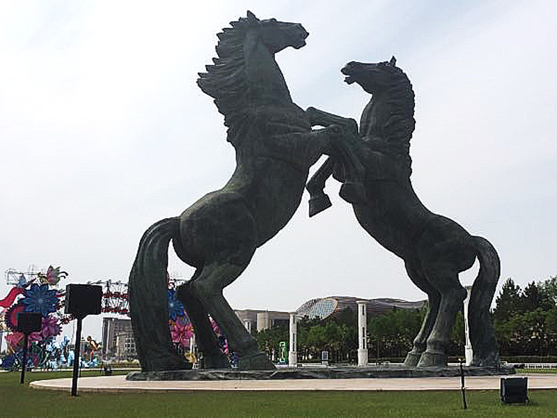 廣場上的凌空騰飛、搏擊爭勝的雙駿青銅雕塑,高15米,與成吉思汗廣場上的群雕相輝映,寓意鄂爾多斯人民奮進的精神風貌,成為鄂爾多斯奔向美好未來的象征。