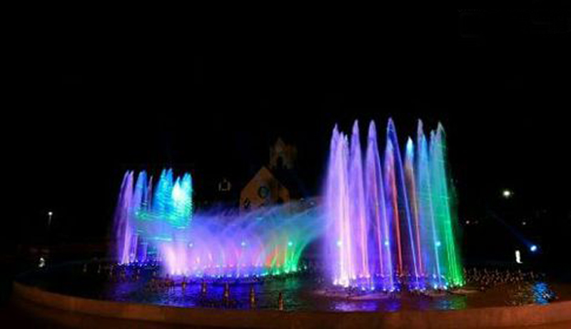 噴泉會隨著音樂的變化而變化,水柱時高時低,跟著音樂一起起舞,絢麗奪目的燈光打在水柱上,五顏六色,煞是好看。