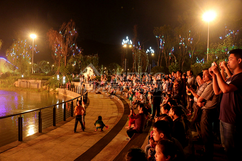五光十色的酷炫激光、歡快動人的音樂,水霧與光折射出的果城著名景點萬卷樓、白塔等,吸引上萬市民前來觀看。